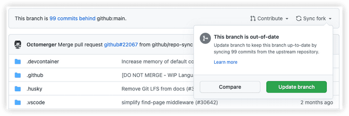 This step requires attention because some projects may have frequent updates. Before making modifications and submitting a PR, it's possible that there may be new commits and merged PRs in the original project. If this situation occurs, your forked project in your workspace will show that the original project has been updated. For example: