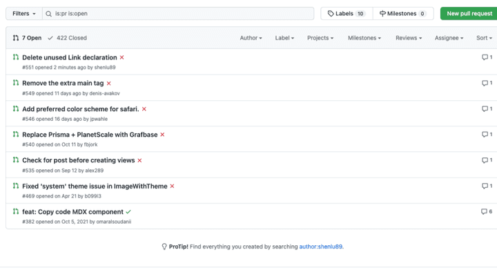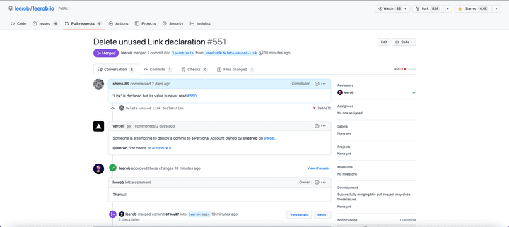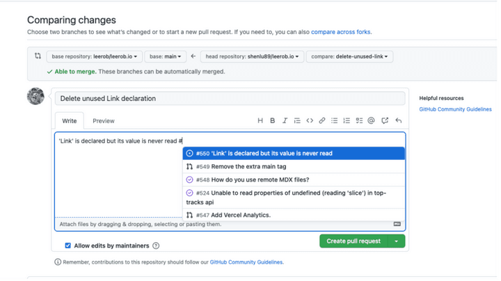 Previously, I wrote an article summarizing the open-source projects I participated in and my experiences in 2021. However, it was more of a rough summary without specific details on the actual workflow. Coincidentally, recently I came across a GitHub project (https://github.com/leerob/leerob.io/) and found a small issue in it. Following the basic collaboration workflow recommended by GitHub, I submitted an issue and a Pull Request (PR) to the project.