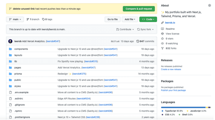 Finding a target project is straightforward, in this case: https://github.com/leerob/leerob.io.